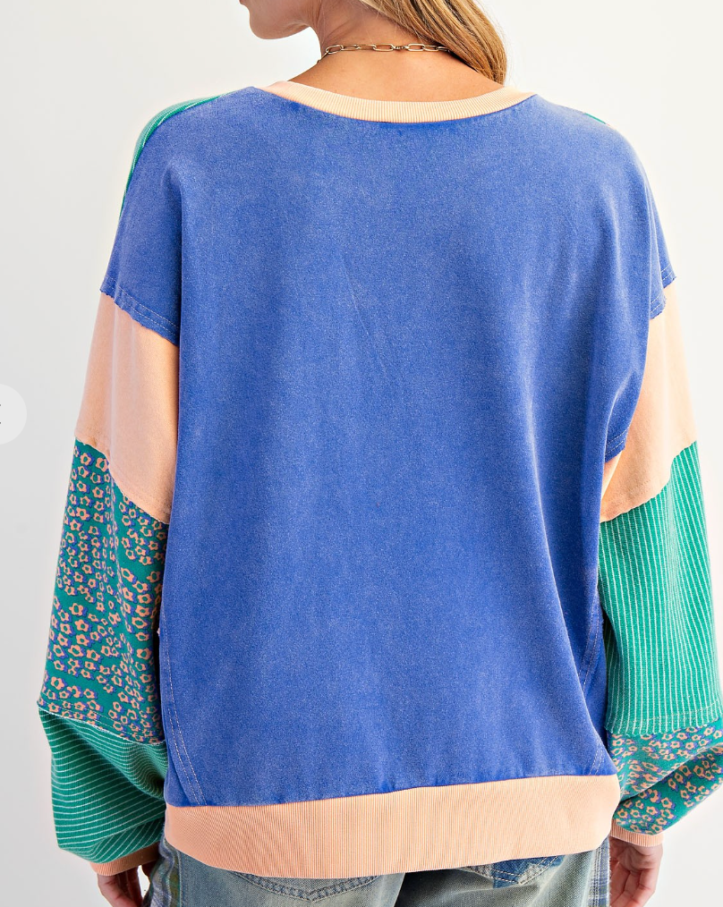 Patchwork french terry mineral washed long sleeve pullover with drop shoulders.