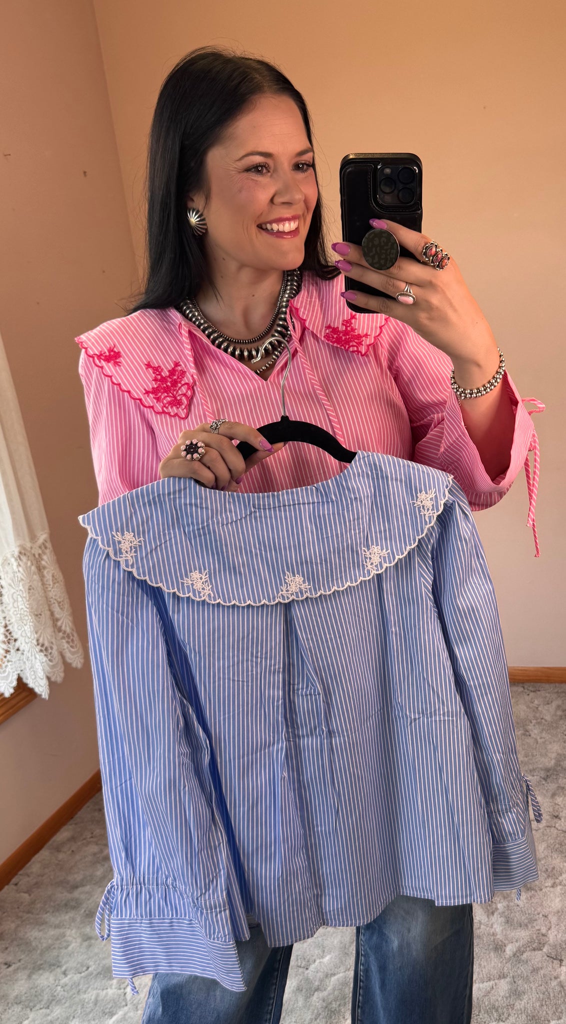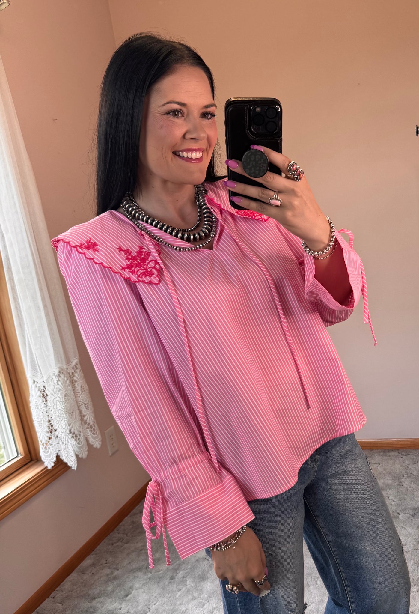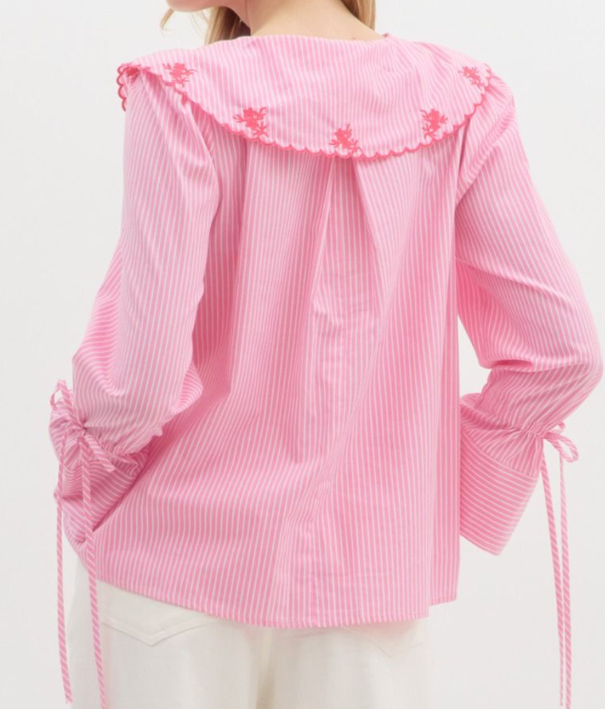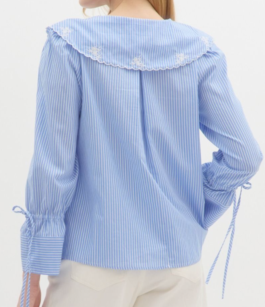 Stripe pattern long sleeve adjustable sleeve pullover top featuring embroidered oversized peter pan collar