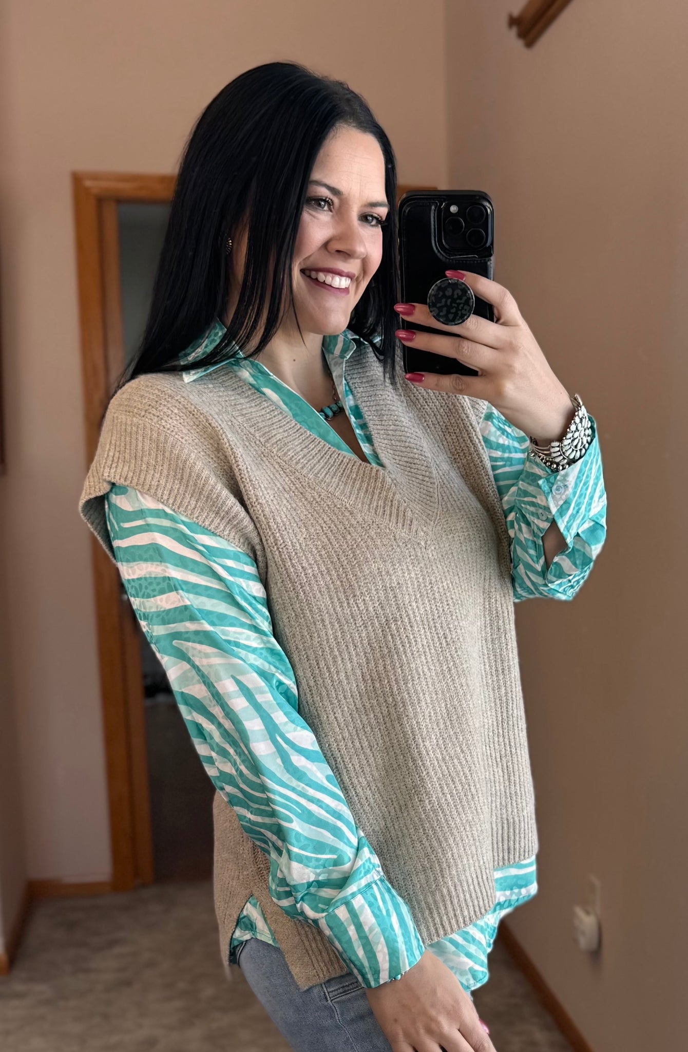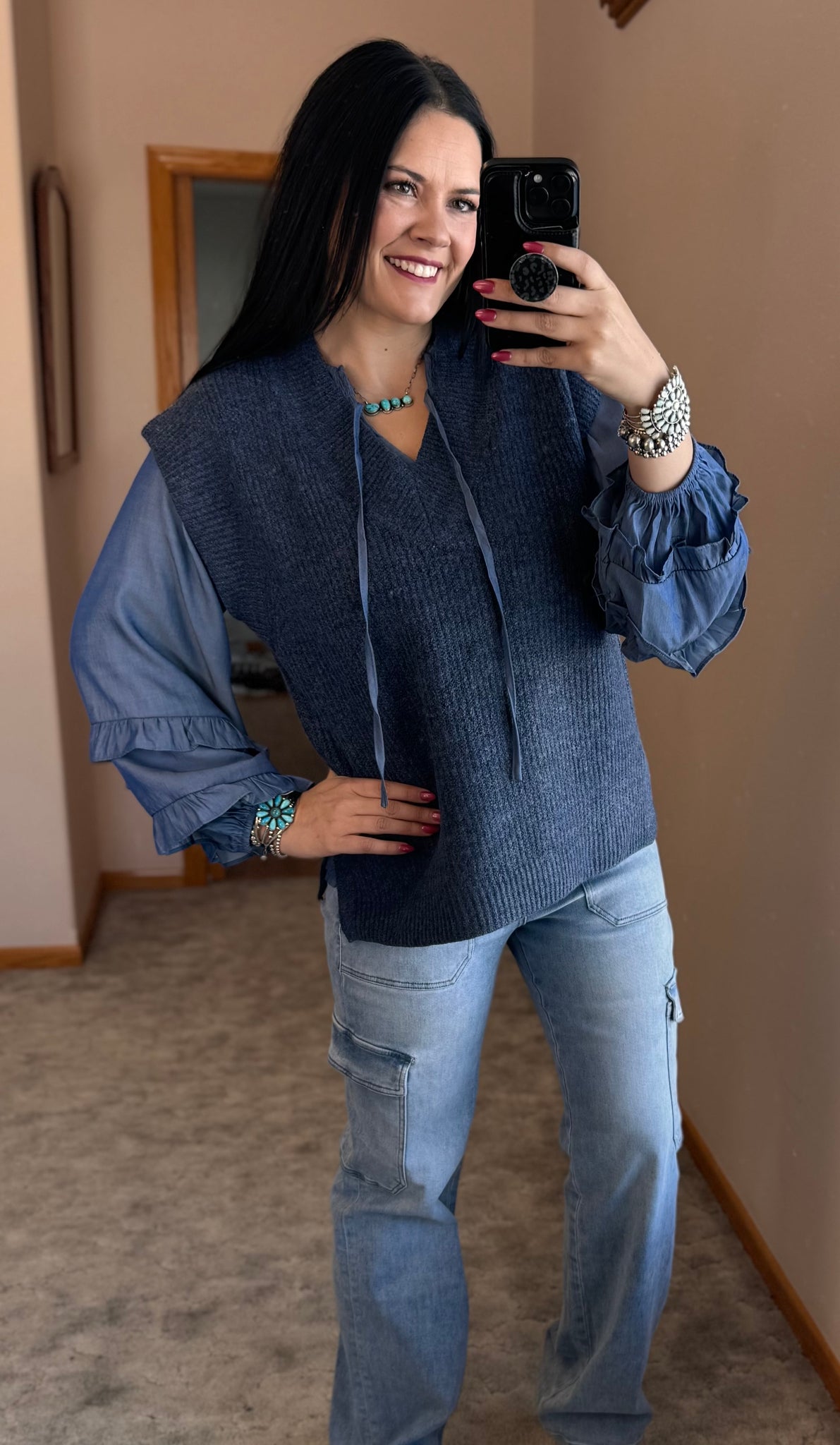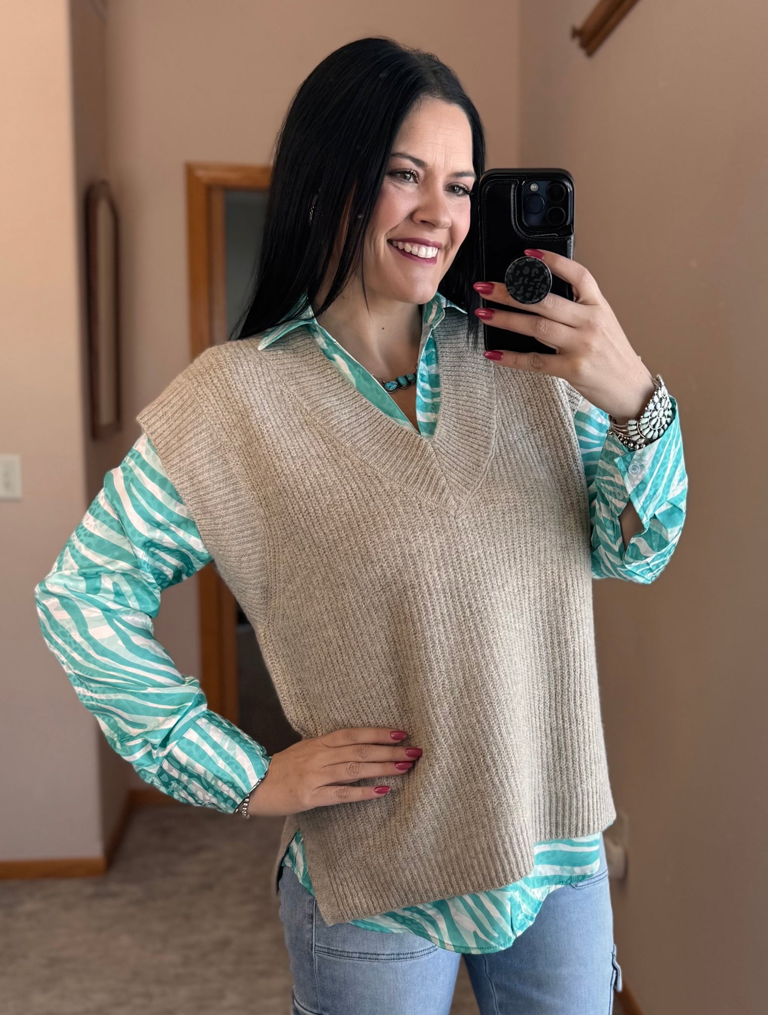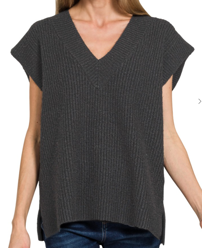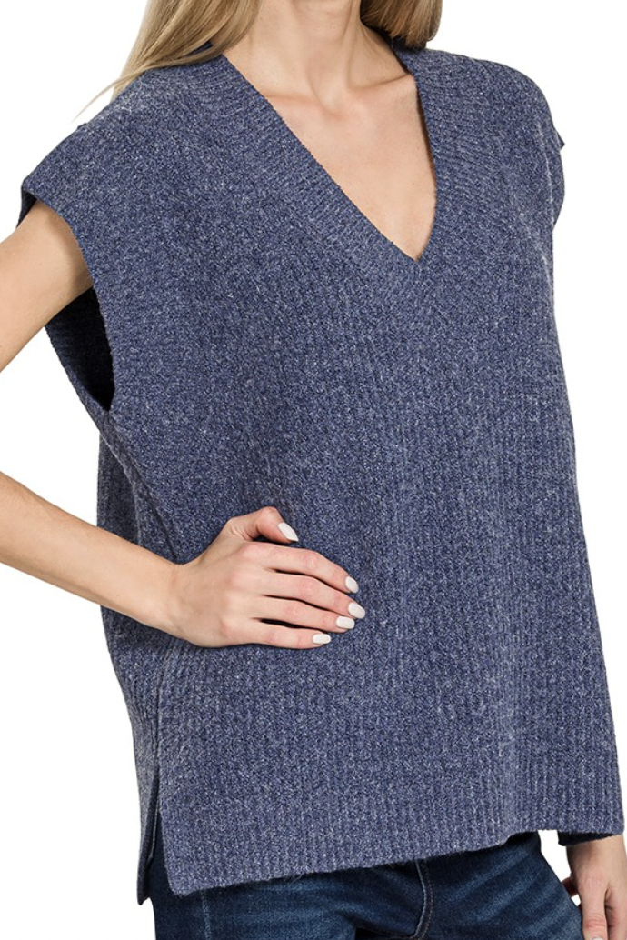 Relaxed fit knit vneck sweater vest with side slits with a longer fit that other one.
