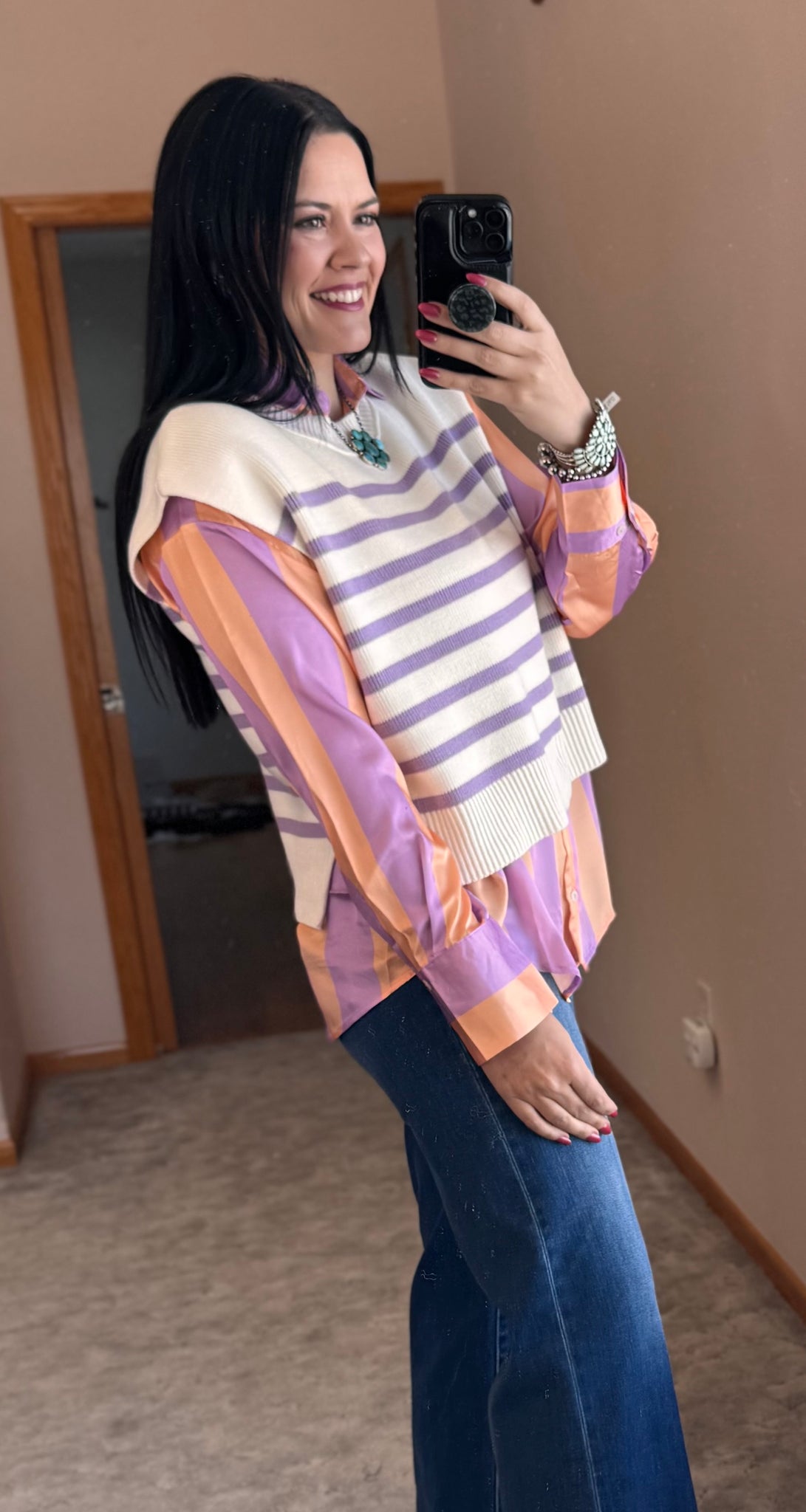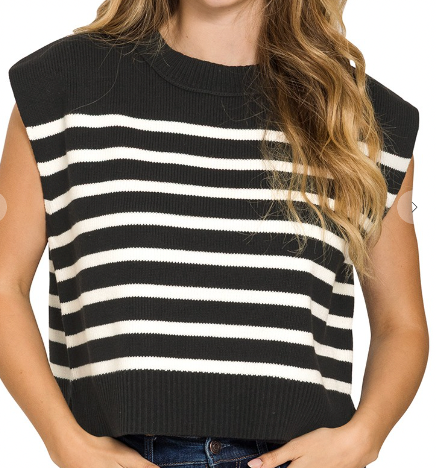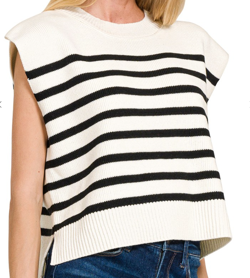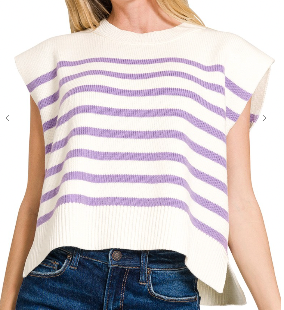 Knit round neck striped sweater vest with side slits.