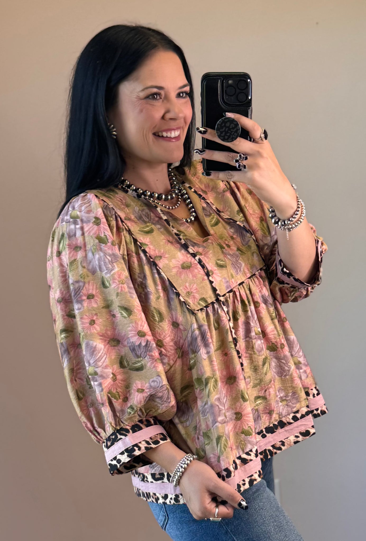 Camel floral pattern ¾ sleeve top featuring leopard band and hem detail.