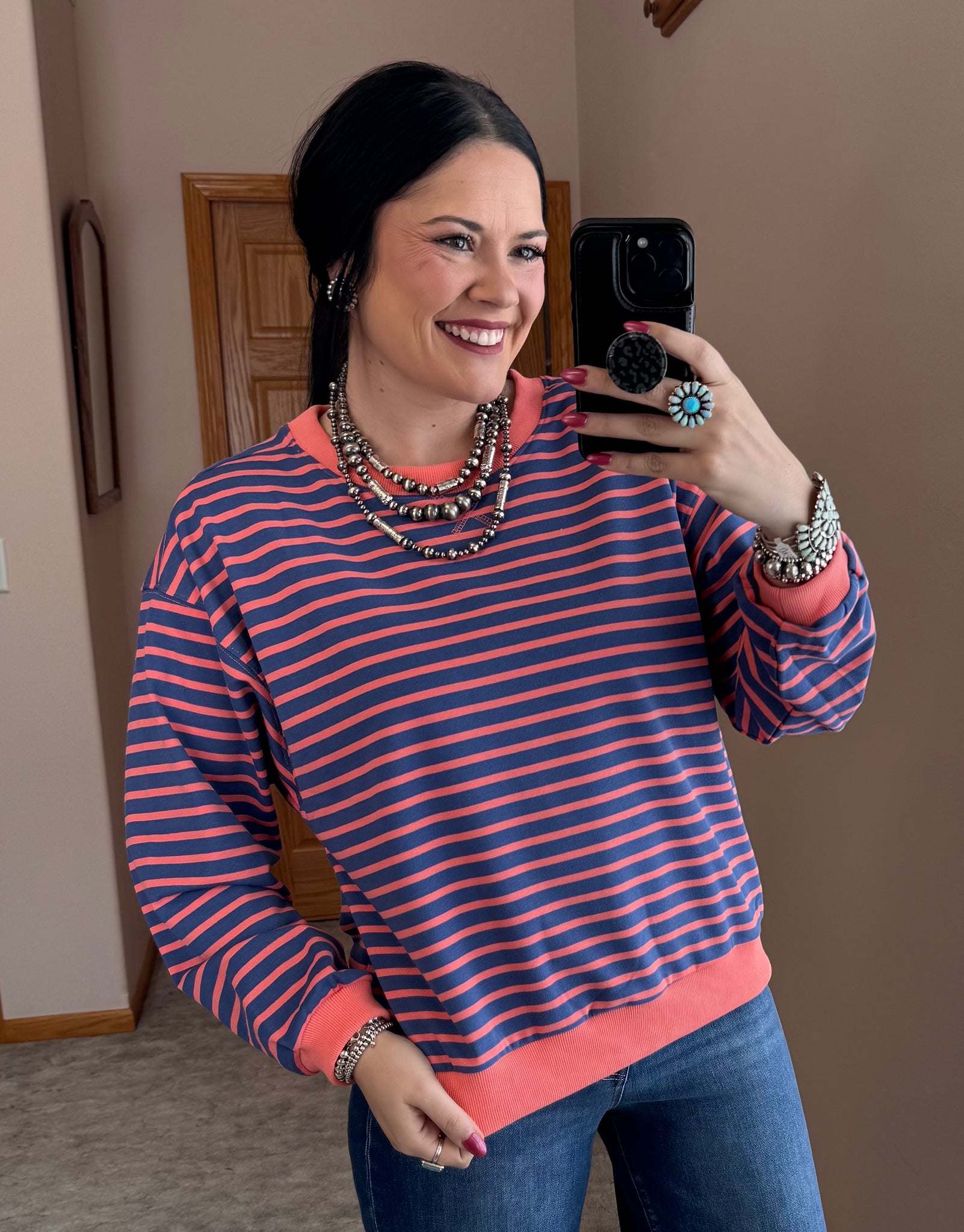 Drop shoulder stripe top with v-notche neck, solid contrast binding detail.