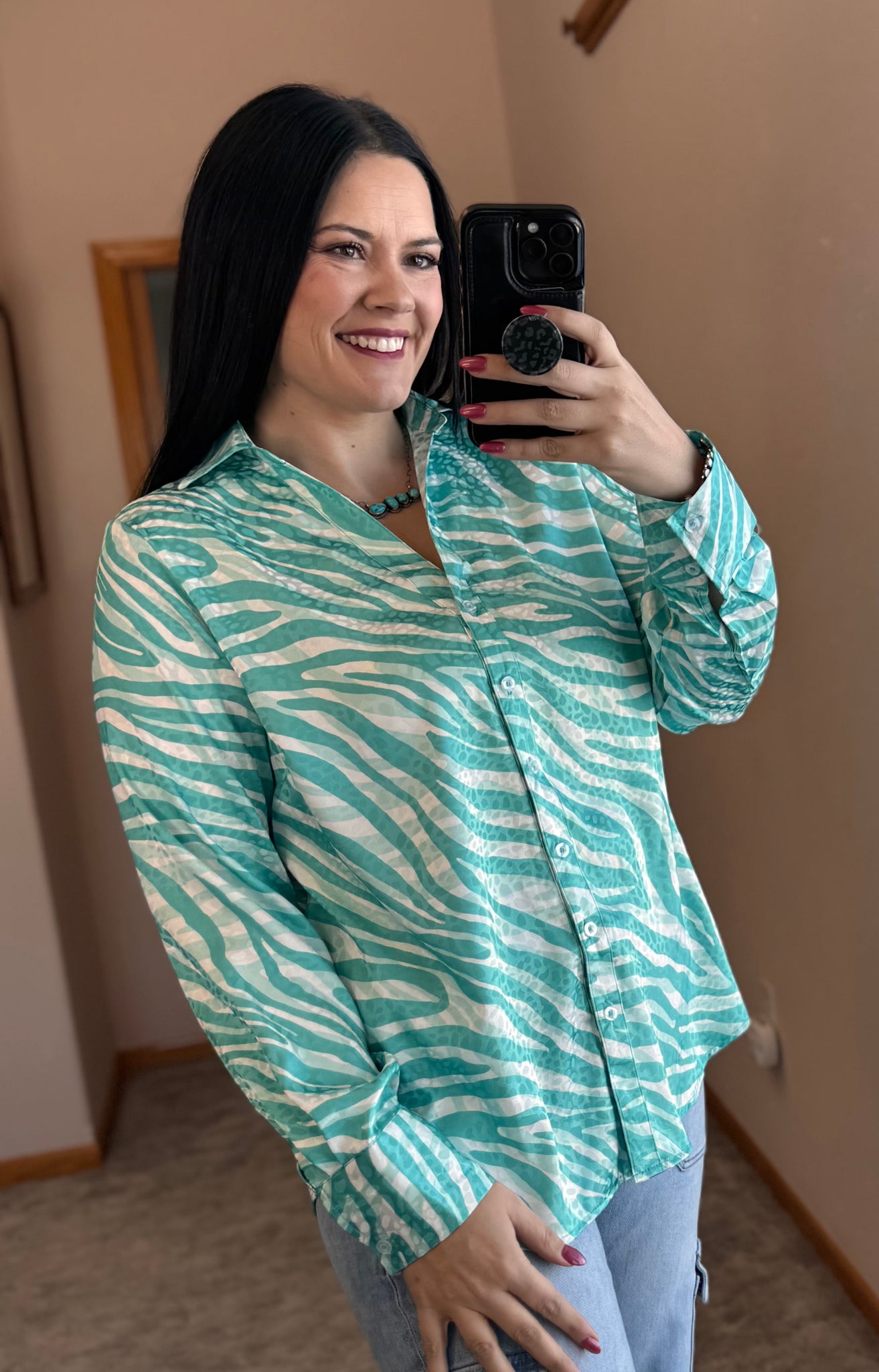 Jacquard zeba satin button down long sleeve collared top.