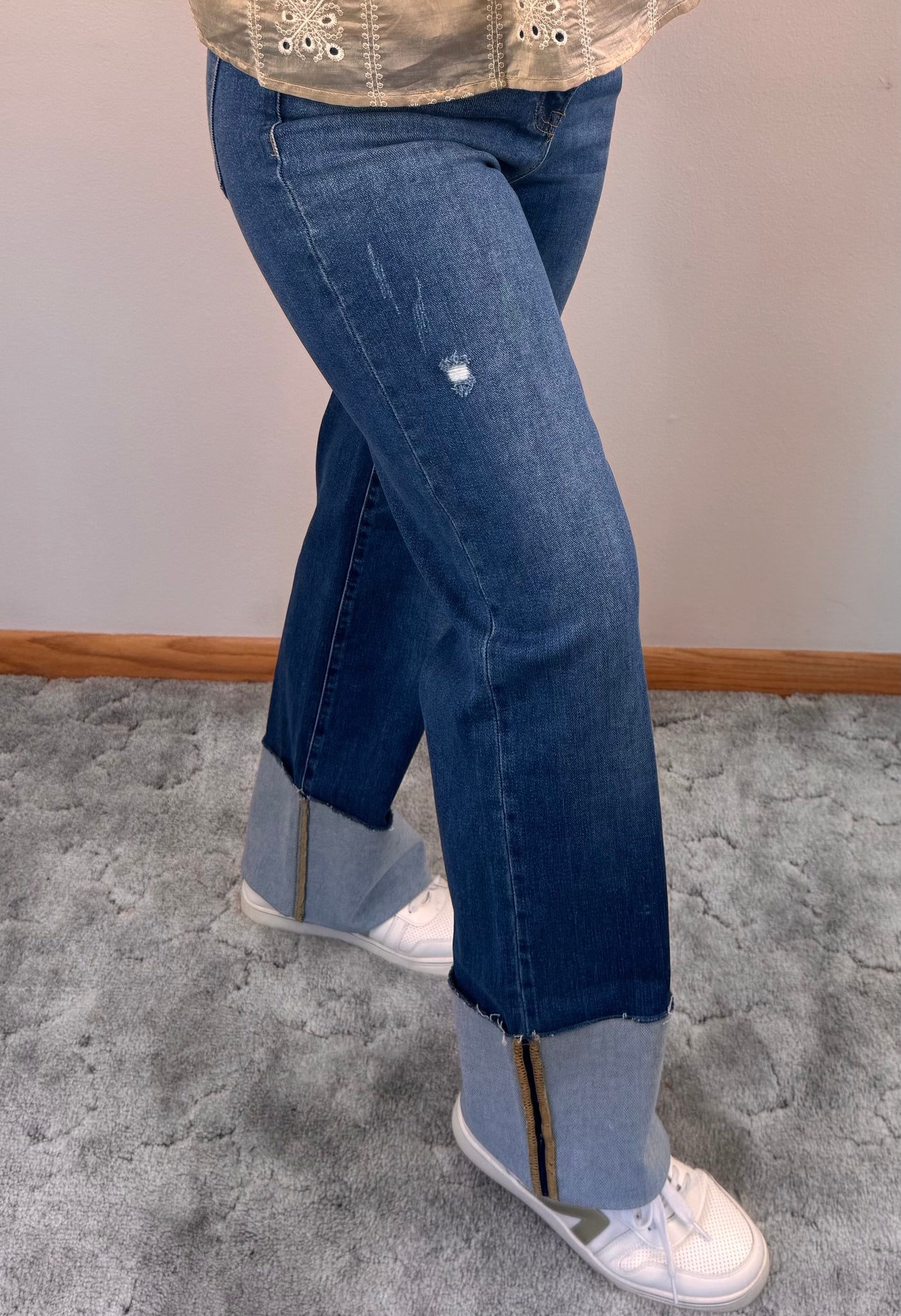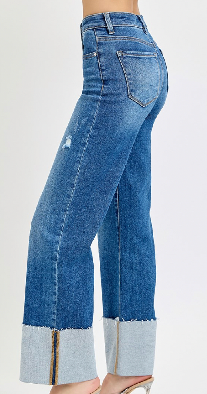 Dark Wash Wide Leg Cuffed Risen Jeans