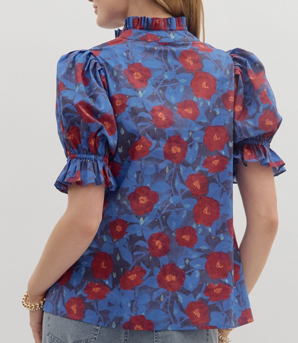 Floral pattern short puff sleeve pullover top featuring pleated ruffle V-neck band collar.