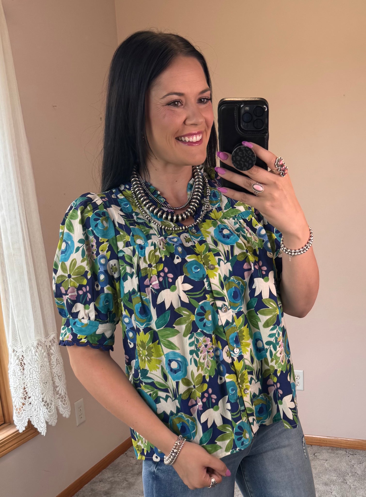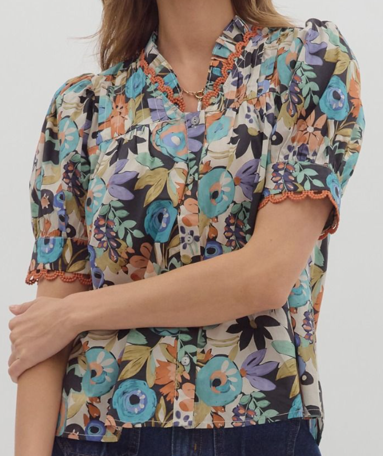 Multi-floral print scallop trim accent cuff band short puff sleeve top featuring frilled V-neck pintuck yoke front panel.