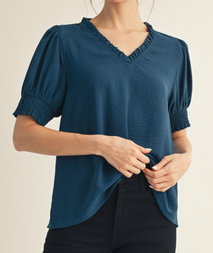 Solid top with frilled V-neck, puffed short sleeves, and stretch-band cuffs.