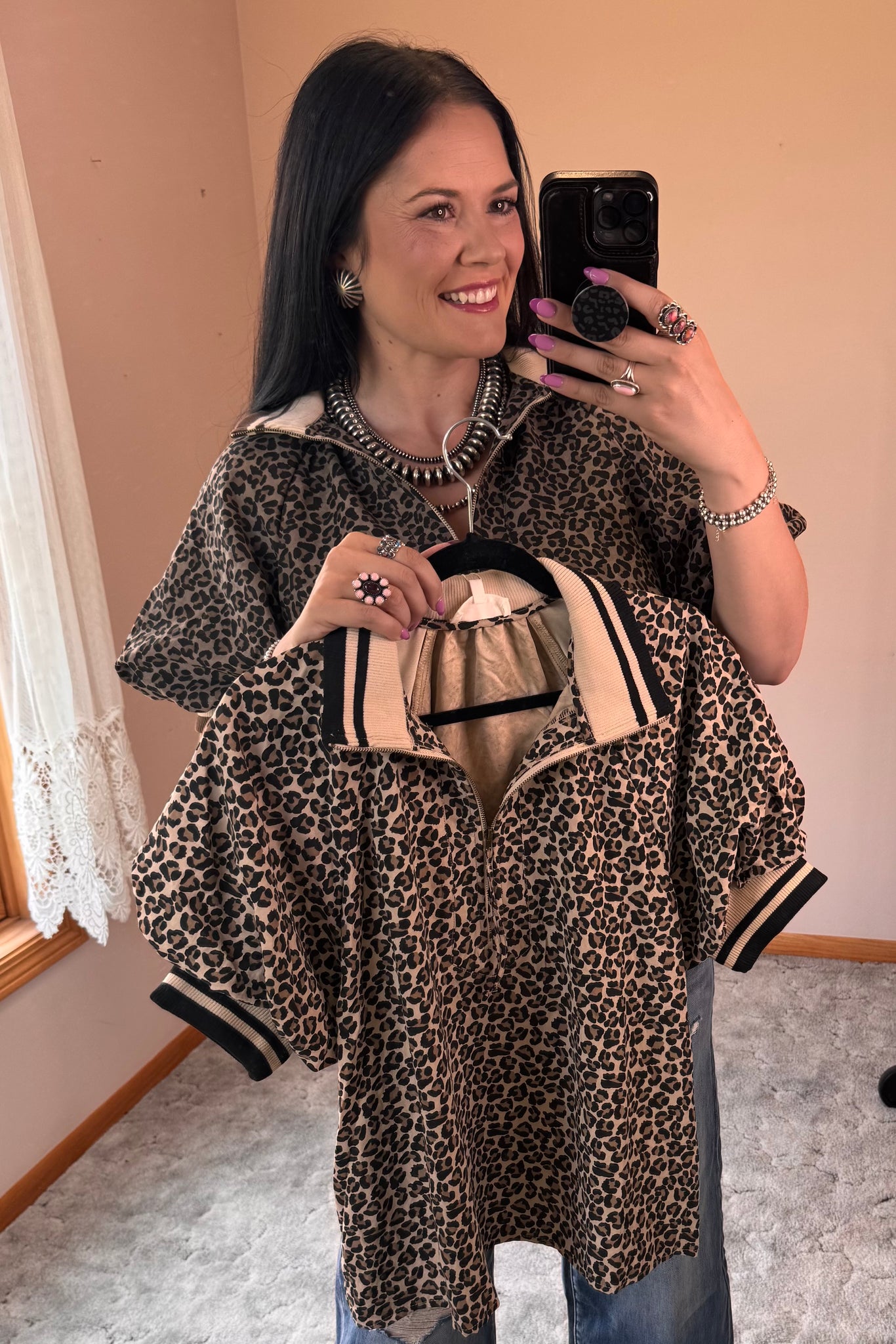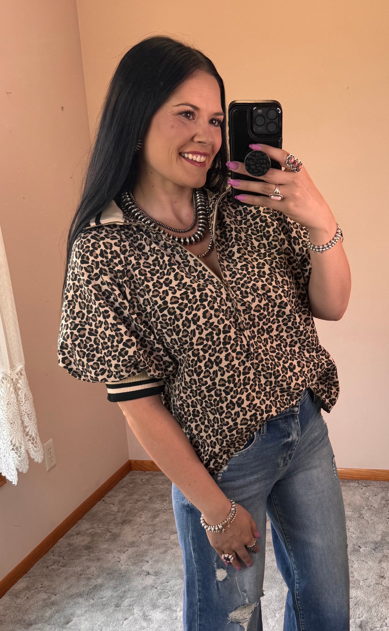 Leopard pattern short puff sleeve half-zip top featuring multicolor band collar.