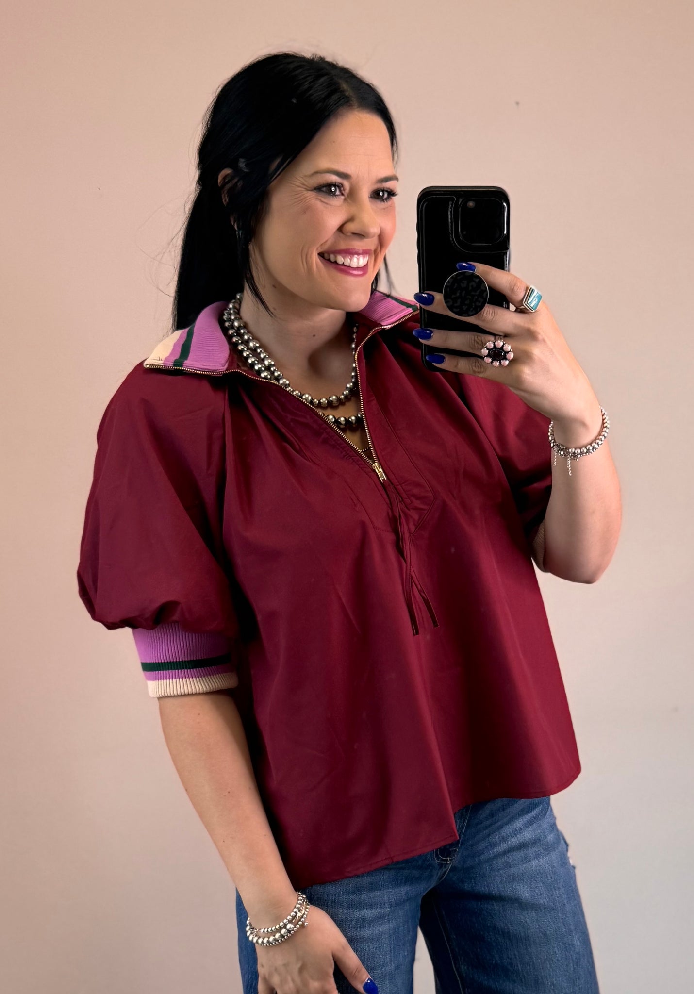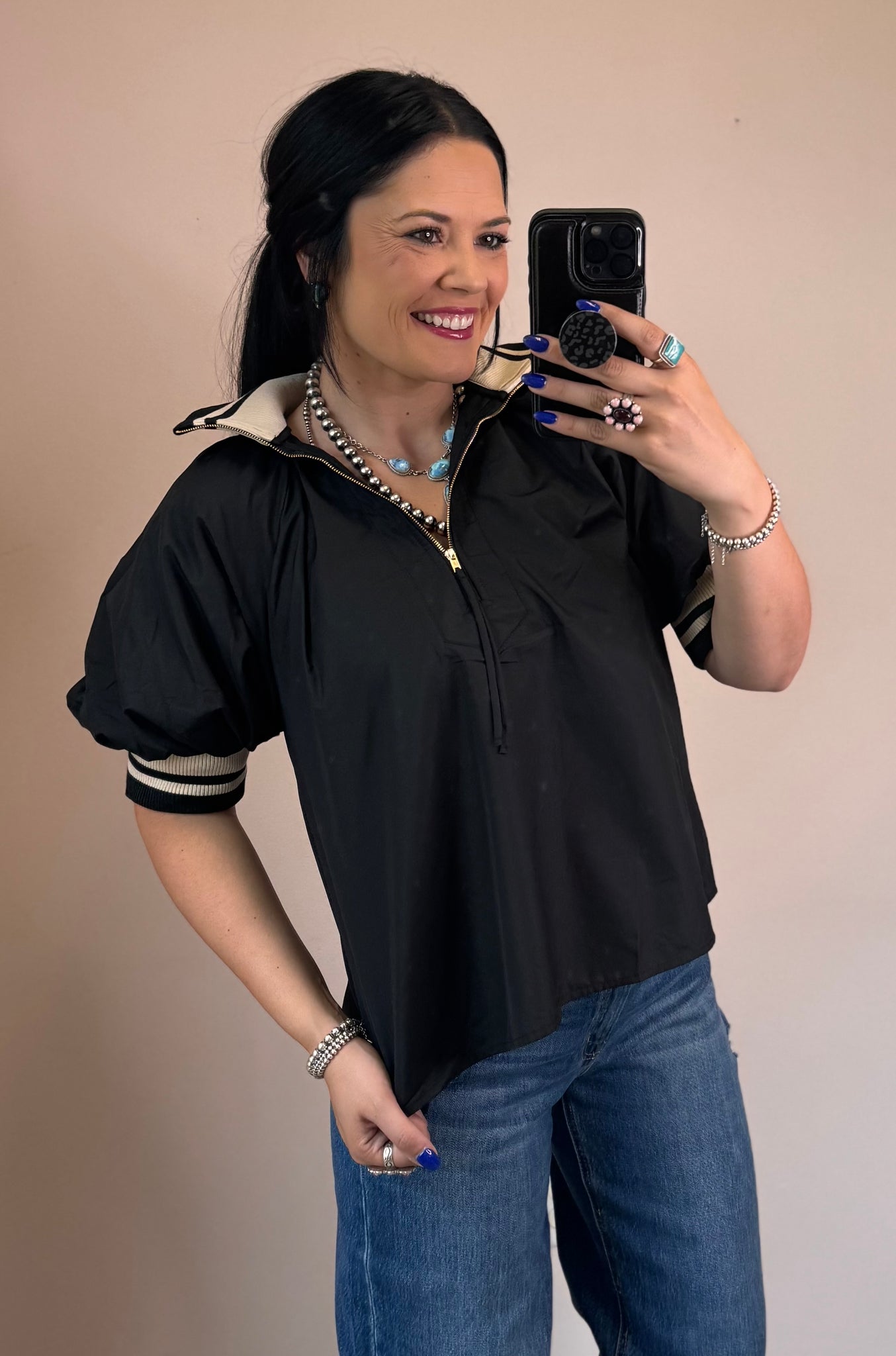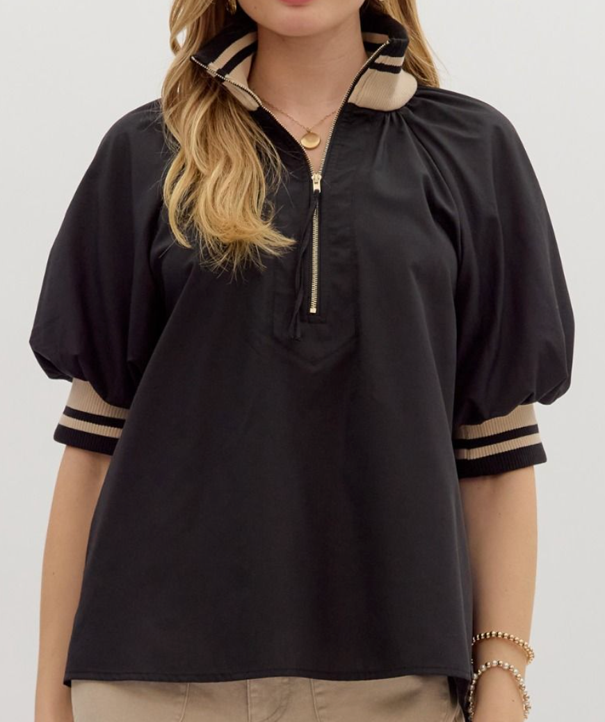 Solid zip-front closure elbow-length sleeve top featuring multicolor accent band.