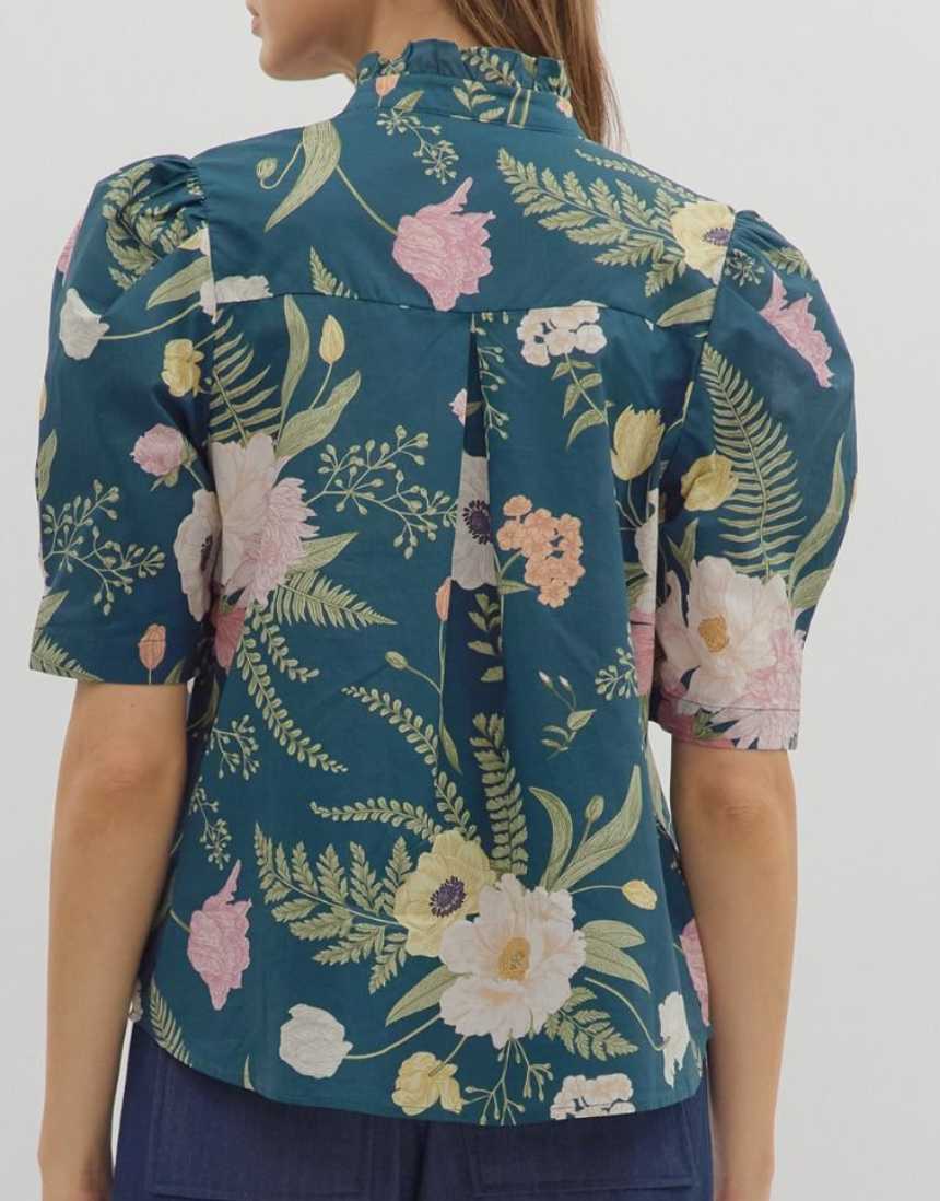 Floral print ruffled neck button front closure featuring pleated short puff sleeve.