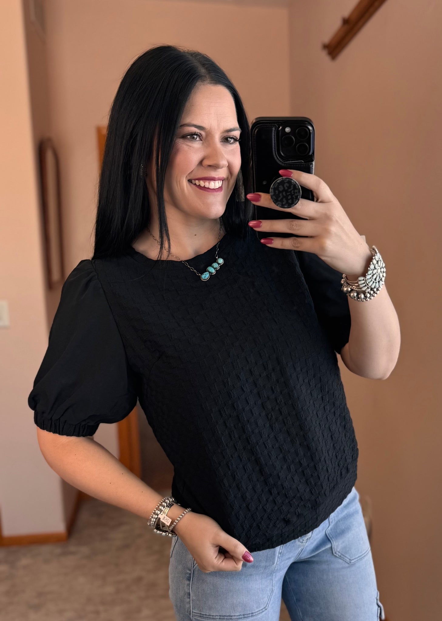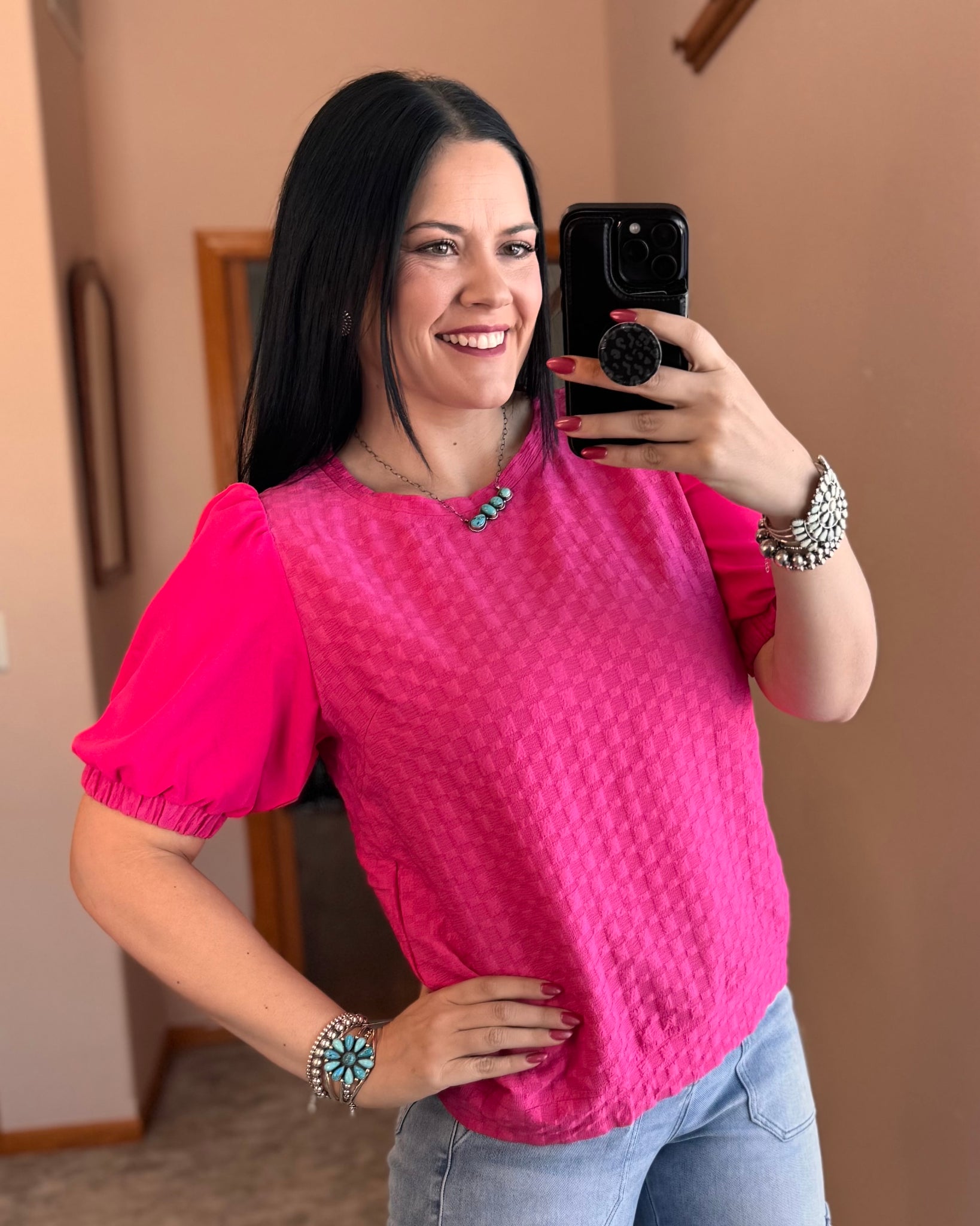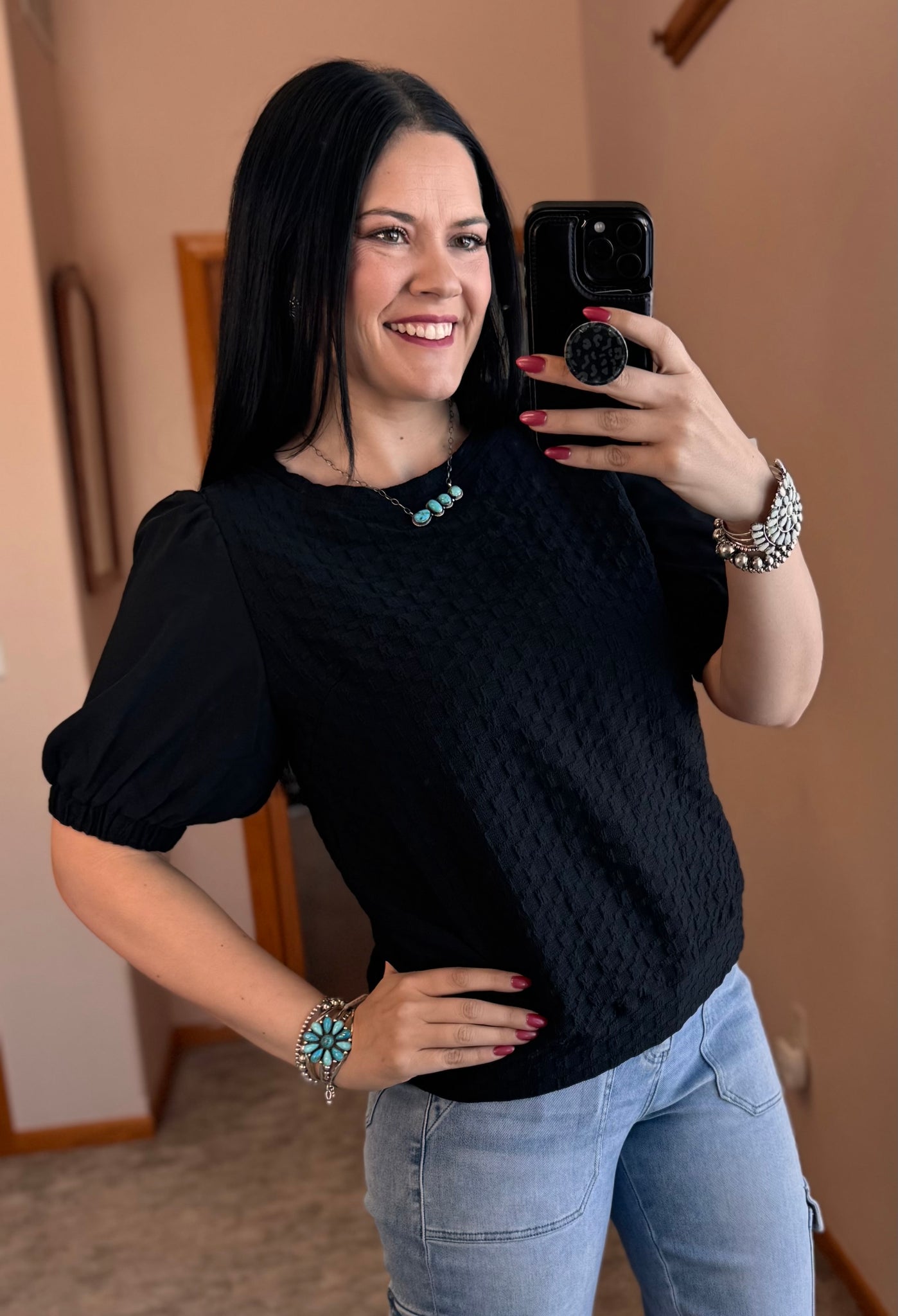 Jacquard Texture Top with Solid Half Sleeve